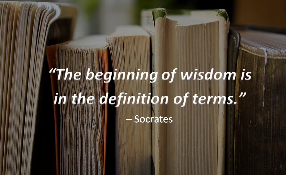 That exercise made me realize the wisdom behind one of Socrates’s (many) great quotes, to the right. One of the things that causes so much confusion, so much angst, so much anger is that we use the same terms and mean different things. (Yes, there are many many other reasons for anger and angst but that’s a story for another time.)