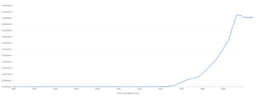 TEENAGERS: as the Ngram to the left shows, the word teenager hasn’t really been used prior to the 1940s, and vaulted into regular use only in recent decades. Before the word “teenager” became a thing, the period of time in life of adolescence, the teenage years, didn’t really exist. Not even 100 years ago, in 1938, 80% of children as young as 14 were working. Back in 1938, you didn’t get to be a teenager, you were a child and then switched to being an adult. Interestingly, the first known use of the word according to Merriam-Webster was 1913, and it definitely took a while for teenagers to be a “thing.” Now teenagers are a “thing” to be reckoned with: in 2020 teens’ spending power was nearly $3 trillion!!!