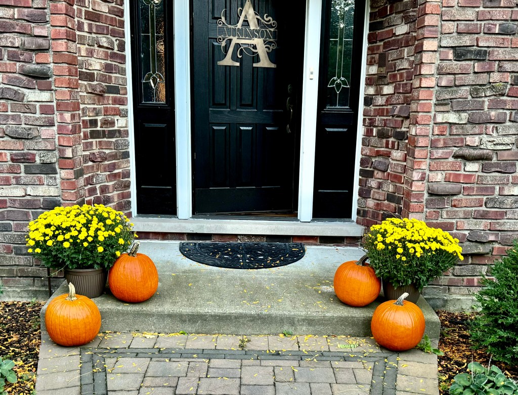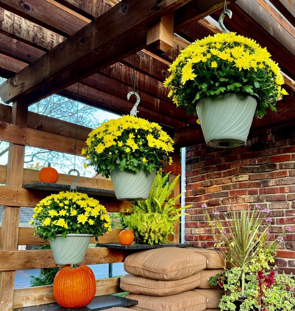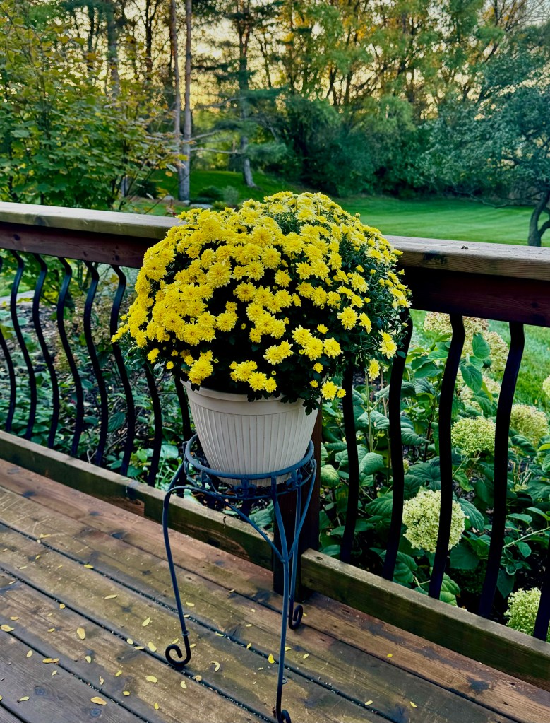 As you can see from the first photo snipped in below, two lovely mums sit alongside some seasonal pumpkins by our front door, and they look great. We have a few sprinkled on the deck as well (additional pics, below). I DO enjoy Paul’s attention to detail this time of year as we say goodbye to some potted plants, and he transitions his ‘deckscape’ for autumn. In about two months, he will replace the autumnal spread with seasonal greenery and holiday décor but for a few stunning weeks in early fall, we’re rolling in squirrel food…err…pumpkins and gorgeous chrysanthemums.