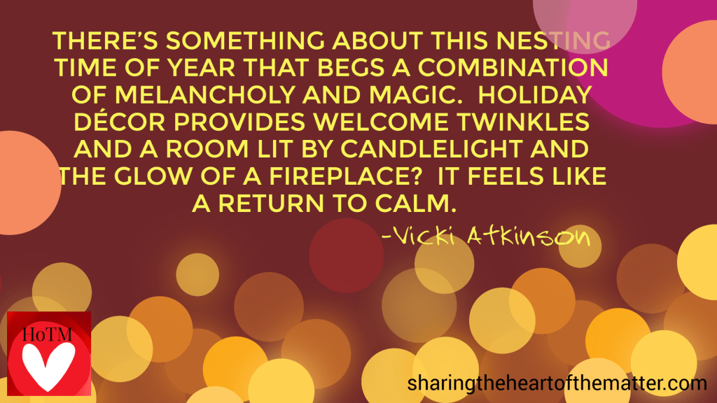 This selection of quotes appear to point out that dark corners are lightened by mutual love and the calm that results from fond memories, in hindsight, are what’s important in life: a fireplace that sparks reverie, a candlelight service that inspires confidence, age that begets wisdom, babies who prompt nurturing, the seasoned wonders of the world, and all those little moments we savor.