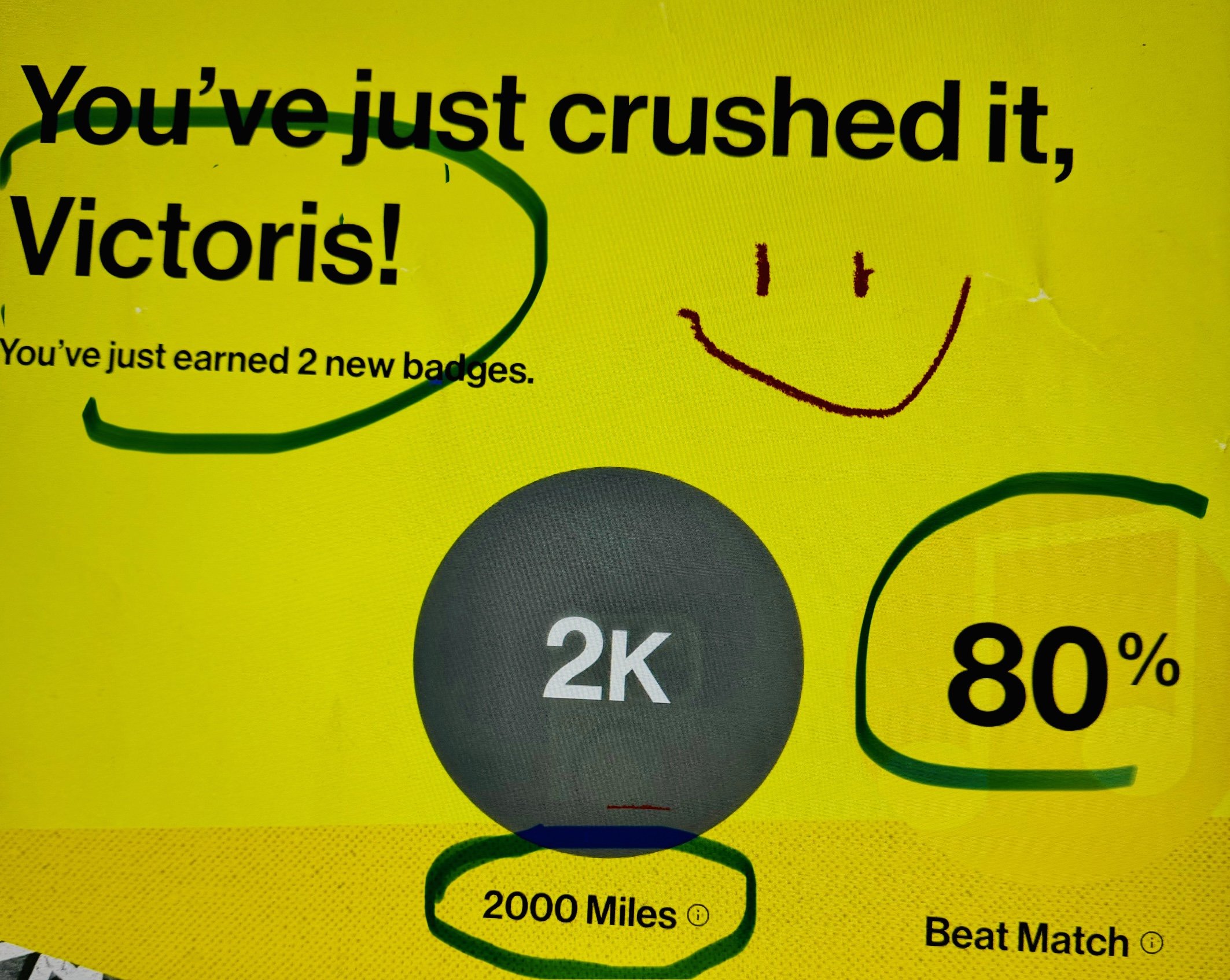 The recent milestone I mentioned? Just as sweaty me unclipped and got my sorry saddle off the spin bike’s saddle, I received an on-screen message. Are you ready? Here it is: