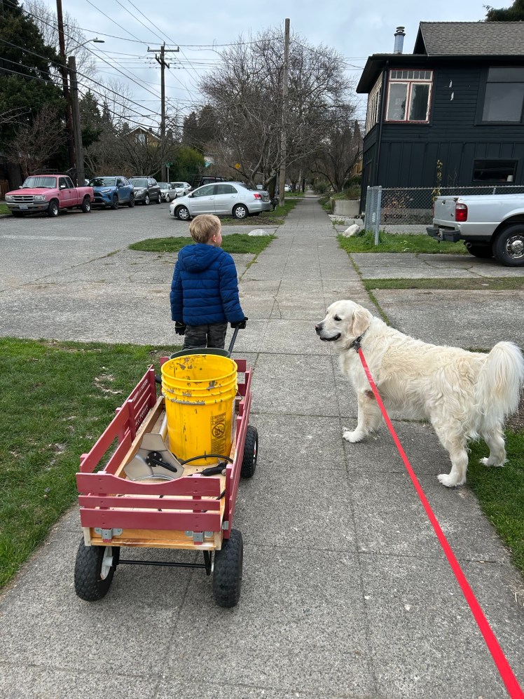 A couple of days ago my five-year-old son, Mr. D, wanted to join me when I took the dog for a walk. He loaded up a red wagon with two buckets and a tire pump and was ready to go.