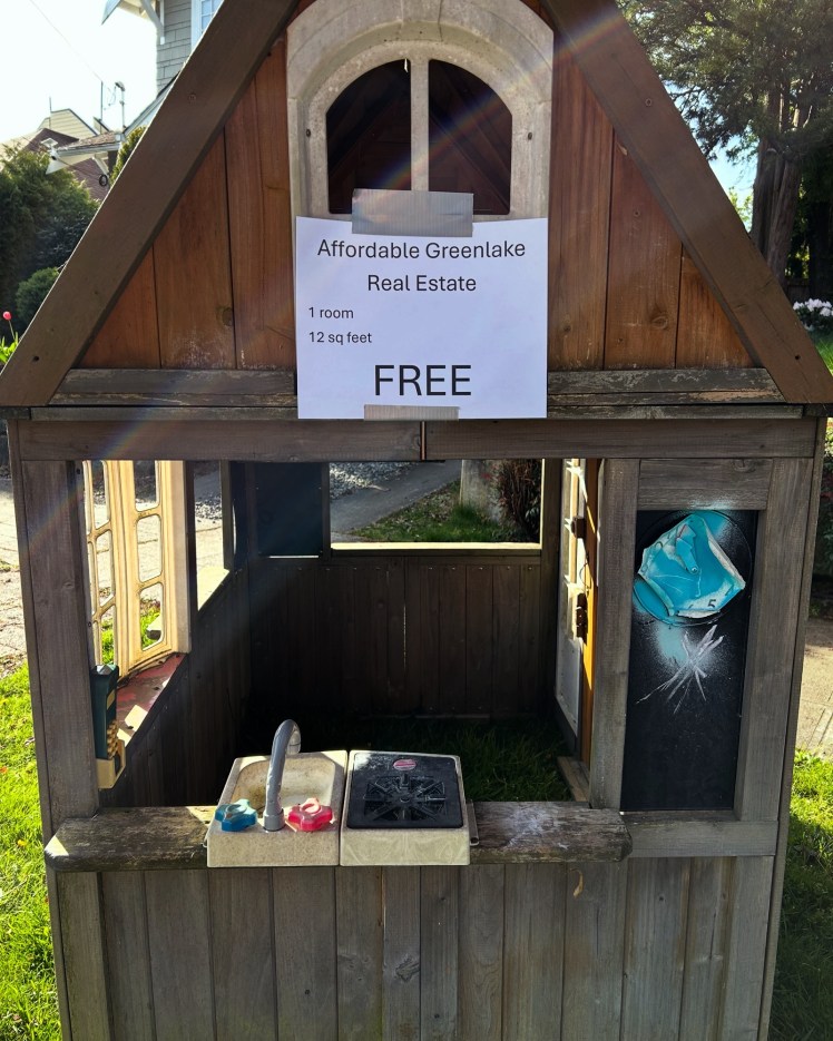I wanted to get it to the curb to give it away before they could change their minds. My friend, Eric, is a marketing genius. He did me the dual favor of helping me carry the playhouse to the curb and gave me the idea for the marketing signage:
